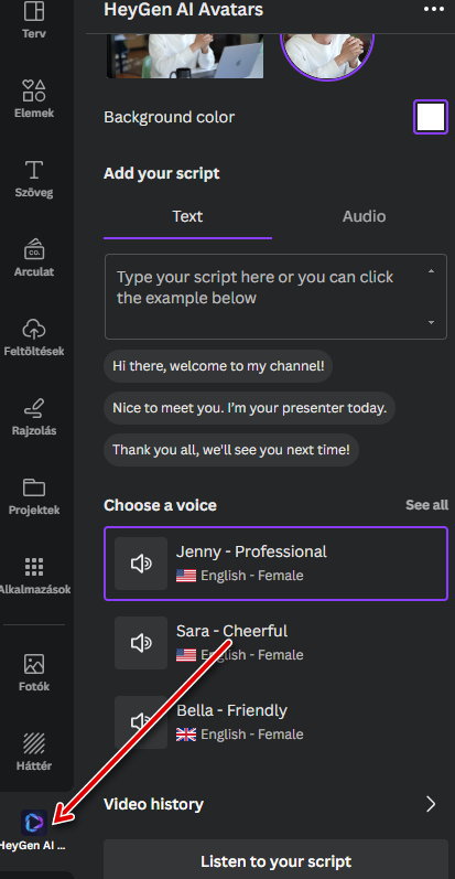 Majd legalul a bal oldali sávban kiválasztod a Heygen funkciót.